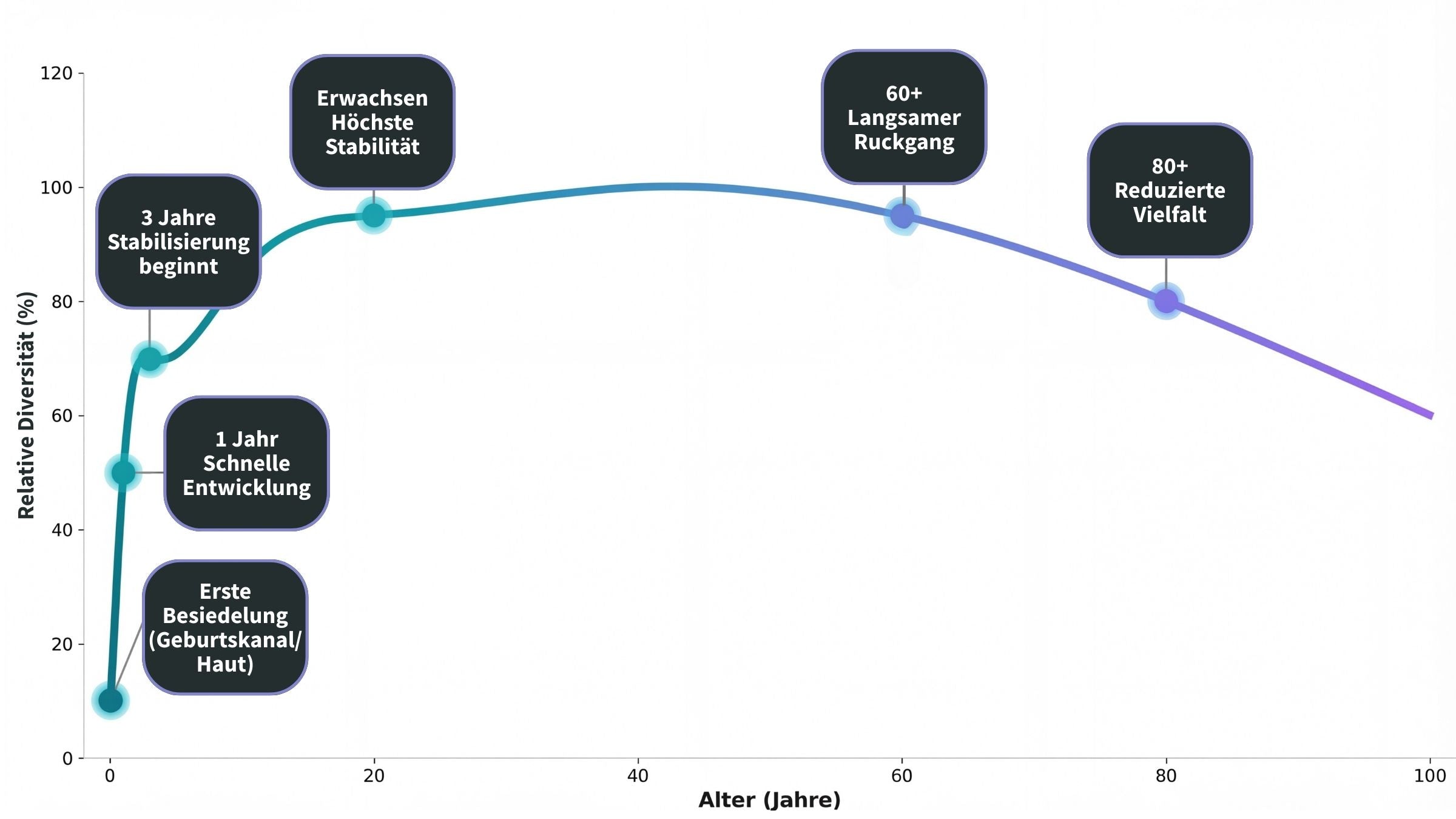 Weniger bekannt ist, dass rund 70 Prozent aller Immunzellen im Darm angesiedelt sind und dass sich über 90 Prozent der mikrobiellen Vielfalt bereits in den ersten drei Lebensjahren aufbauen. Studien zeigen zudem, dass Menschen mit höherer mikrobieller Diversität messbar widerstandsfähiger gegenüber äußeren Belastungen sind. Gleichzeitig kann sich die Zusammensetzung des Mikrobioms innerhalb weniger Tage verändern etwa durch Ernährung, Stress oder Medikamente.